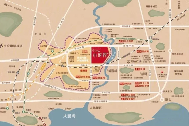 交通:深汕高速、惠大高速、深惠沿海高速大、三大高速环绕、高铁惠州南、三地铁1惠州地铁1号线规划中,深圳地铁14号线延长段规划中,深圳地铁16号线规划中、公交、机场