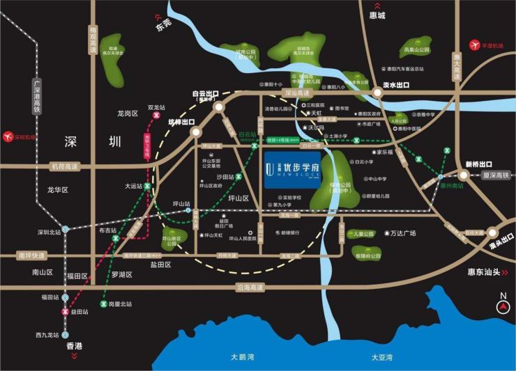 交通方式:惠阳位于粤港澳大湾区“9+2”城市群,紧邻深圳市,是惠州面向深港的门户,项目拥享“深圳、惠阳、大亚湾”三城交汇核心利好,三维立体交通,1小时深港深惠同城,举步即达深圳地铁14号线白云站口,一站抵达深圳。